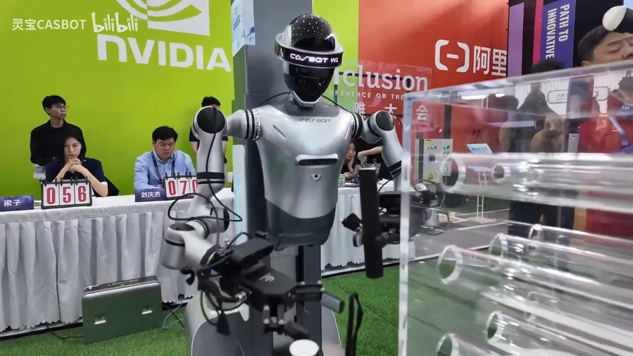 The CASBOT W1 adopts a modular embodied-intelligence architecture made with Alloy and engineering plastic, integrating a wheeled base with a large-stroke vertical lifting column and humanoid upper body. This design enables the robot to reach a working height from 0 to 2.1 m, allowing interaction with shelves, workbenches, and industrial fixtures without bipedal complexity.