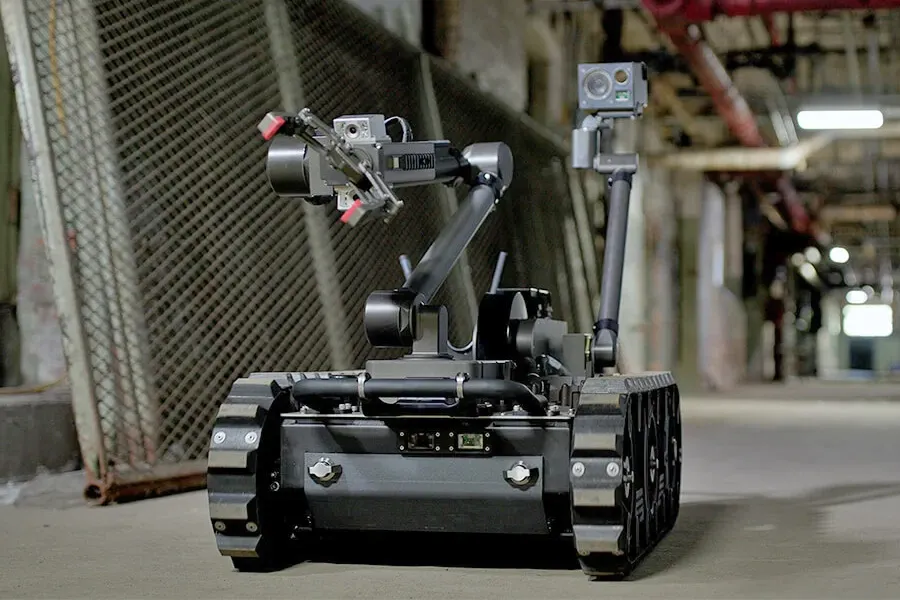 Weighing around 72.6 kg, Centaur combines a highly maneuverable tracked or hybrid locomotion platform with a dexterous manipulator arm that extends over 1.8 m, enabling operators to interact with potentially dangerous objects from a safe distance. Its chassis is ruggedized for stair climbing, lateral slopes, and uneven terrain, allowing it to navigate urban and field environments where threats often reside.