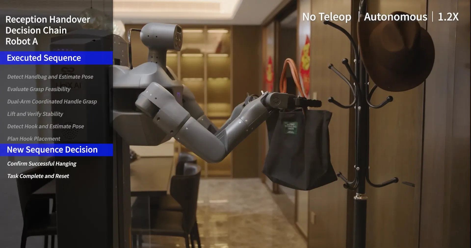 Panther’s 34 high-DoF joint architecture delivers flexible motion and coordinated action precision across its upper body, enabling capabilities such as liquid pouring with predictive modeling, object sorting, fine gesture manipulation, and multi-step task execution. Its vertical torso lift range (~80 cm) extends its reach from floor-level tasks to elevated surfaces without repositioning the base, simplifying operations in shelving, counter, or interaction-height tasks. The 48 V power system and high-density battery support sustained activity and stable torque delivery in dynamic execution sequences. UniX AI’s software stack, incorporating imitation learning, visuotactile fusion, and long-horizon planning, allows Panther to generalize tasks with minimal training data, enabling rapid adaptation to new or previously unseen operation scenarios.