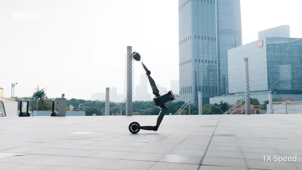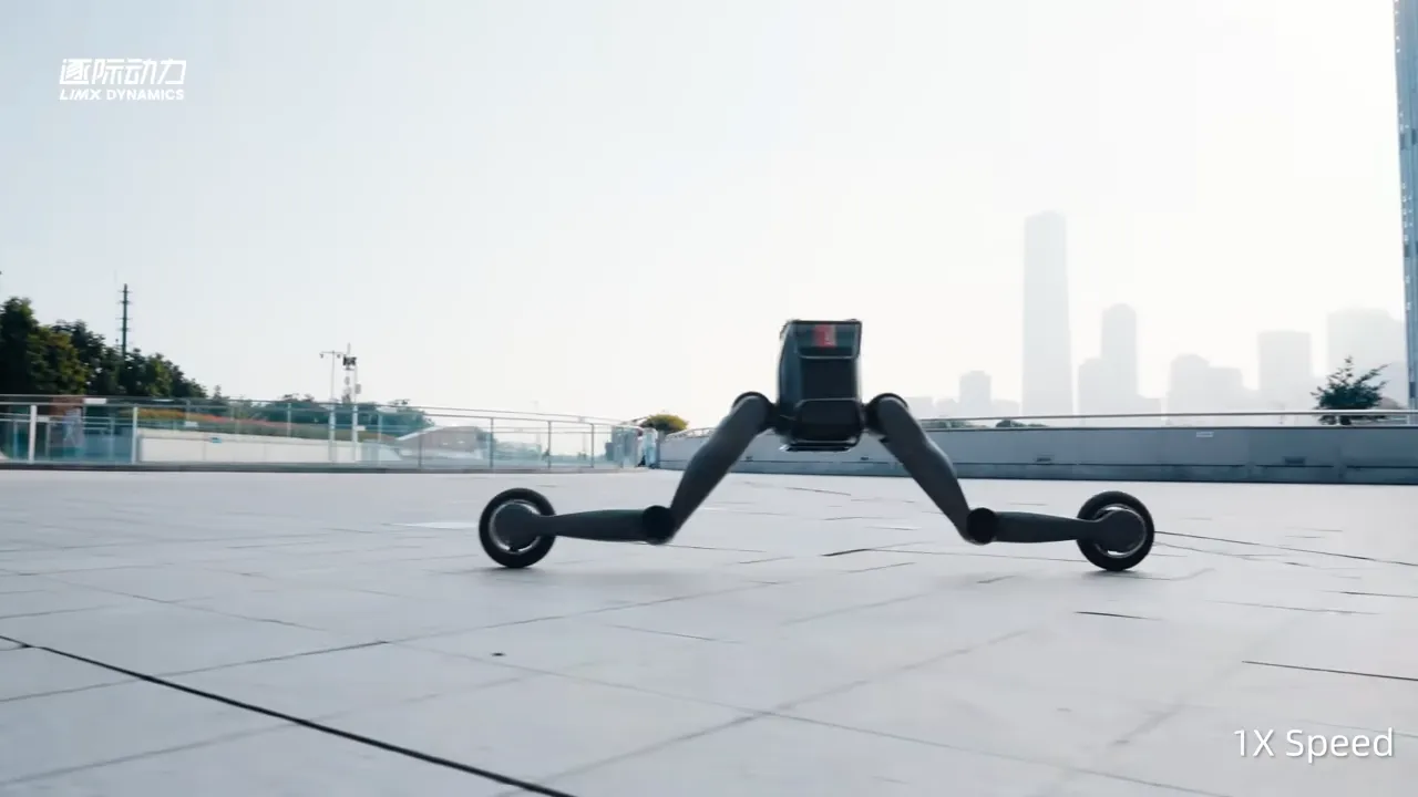 Hybrid mobility setup that combines wheel speed with leg articulation, achieving speeds of 3–5 m/s and supporting up to 30 kg payload when walking on a flat ground and 20 kg payload when climbing stairs.